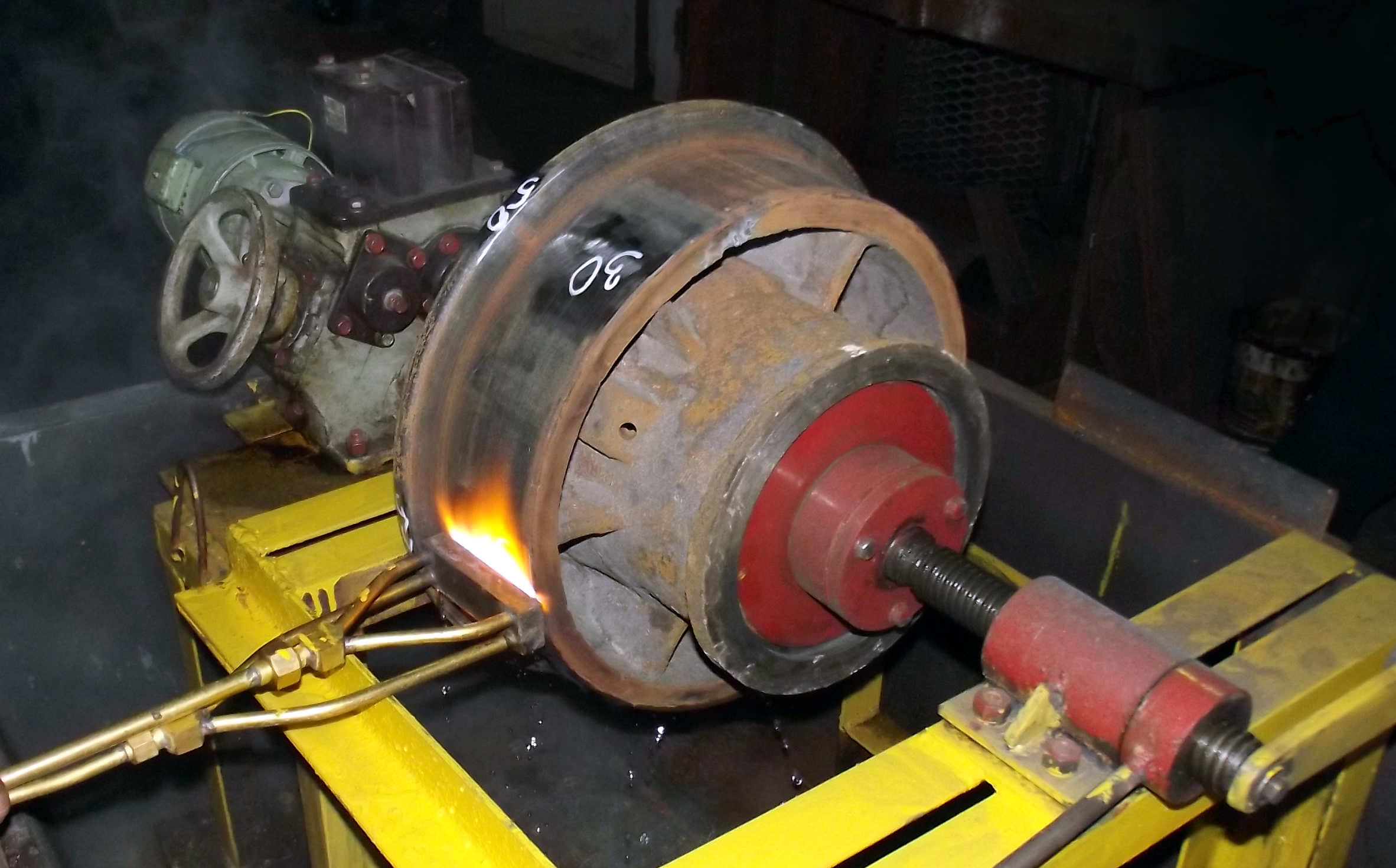 Термическая обработка поверхности катания и реборды колеса вагонетки.